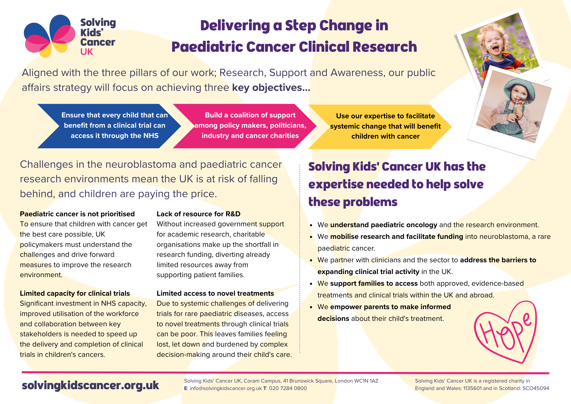 Such desperate situations must change, and no family should feel as if they have run out of options to save their child's life. This is why Solving Kids’ Cancer UK, with support from partners across the sector, has launched its first External Affairs Strategy – set on accelerating clinical research, driving change and Unlocking Hope for children with cancer.